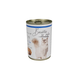 Lata de 415 grs de alimento húmedo de atún, cereales, huevos y sus derivados en salsa para gatos de todas las edades y razas.