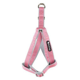 Arnés tipo petral para perros de nylon resistente rojo con estampado de lunares blancos.
